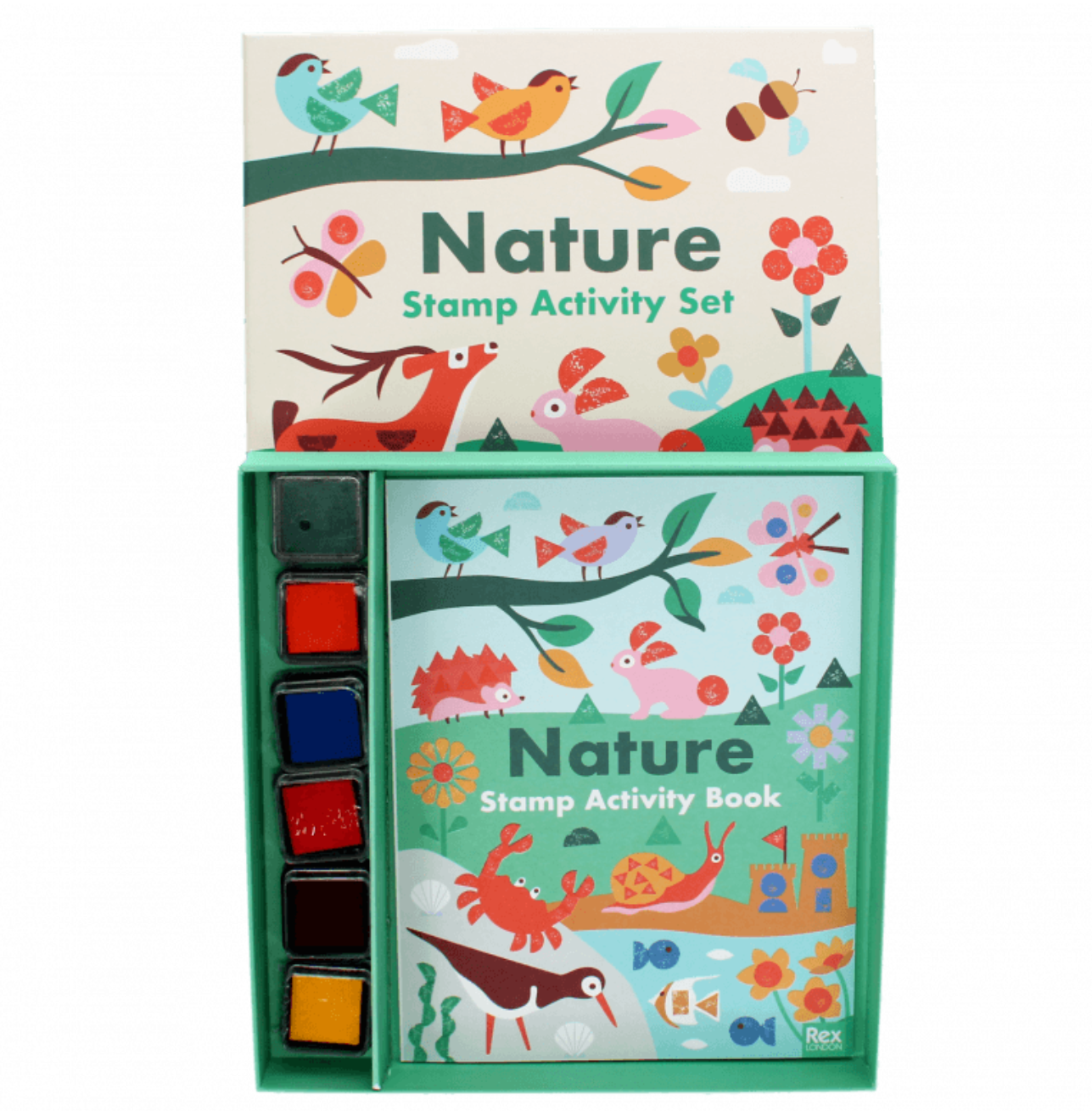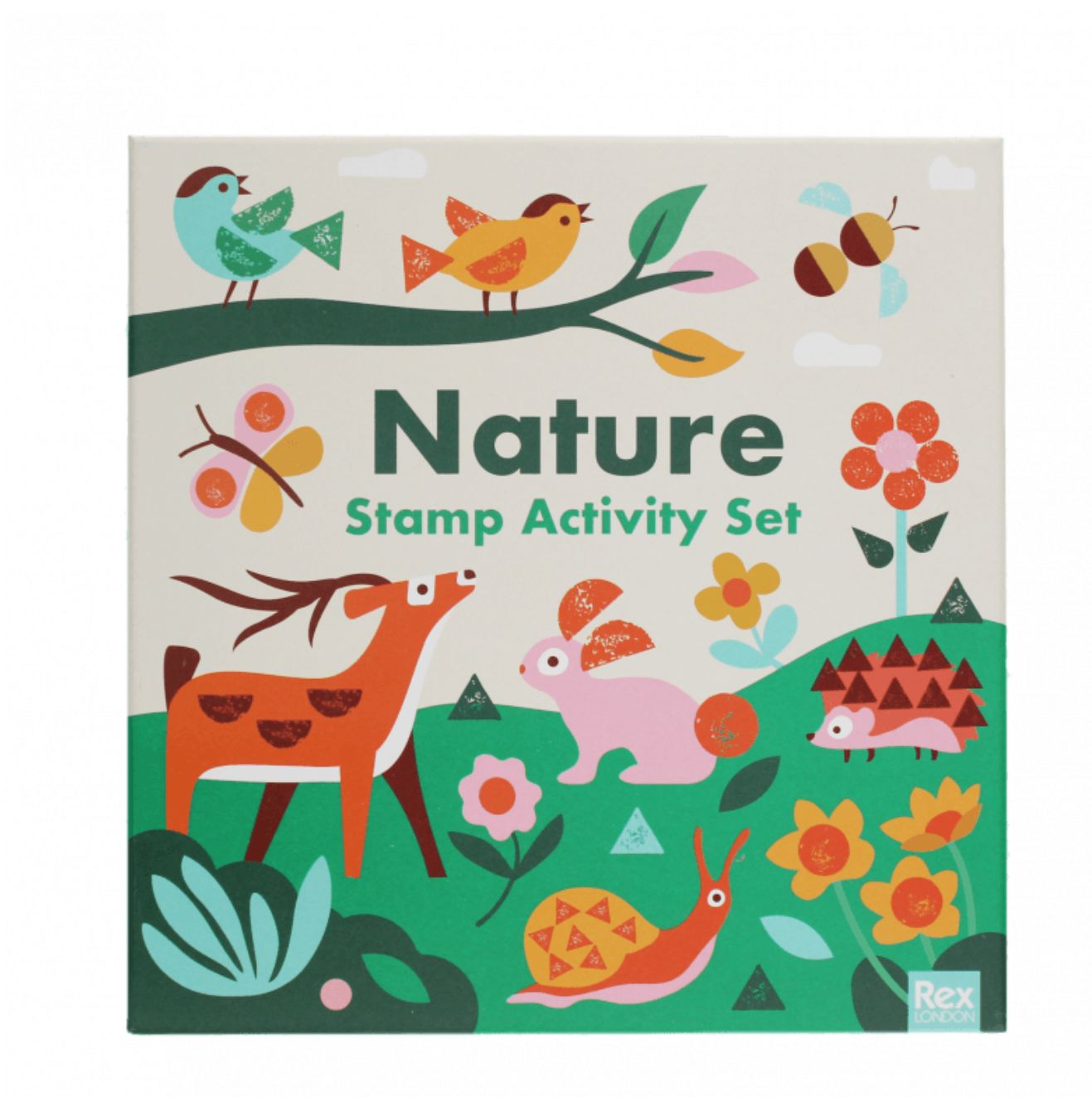 Create some amazing nature-themed pictures with this charming and engaging stamp activity set! Use the shaped stamps and ink pads to add fins to a shark, give a hedgehog his spikes, or decorate flowers, trees, snowmen and more.